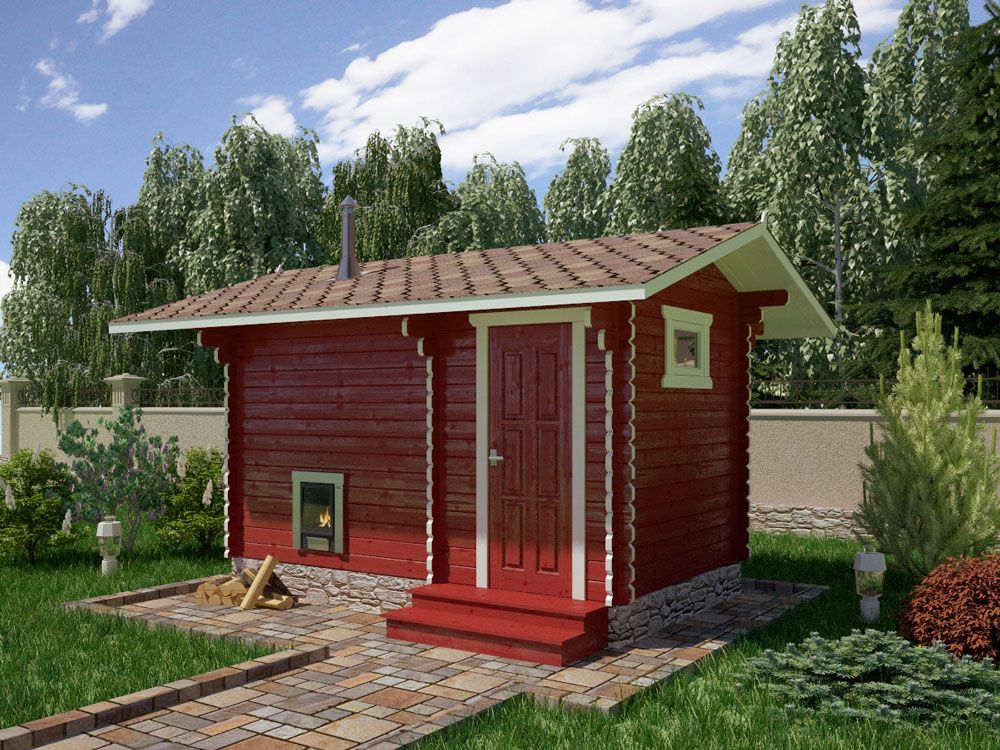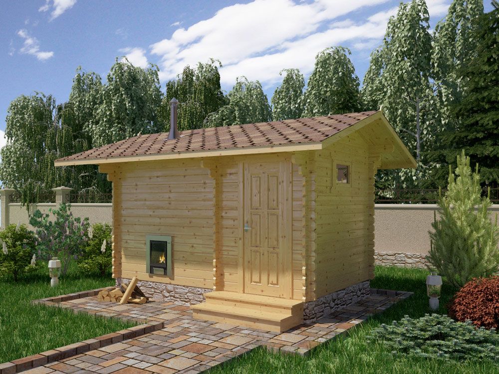 Идеальный вариант садовой бани для 2-3 человек. При использовании дровяной печи, топку лучше разместить со стороны навеса и закладывать дрова с улицы. Рекомендуем парилку в данном варианте совместить с «помывочной» (доп. опция).