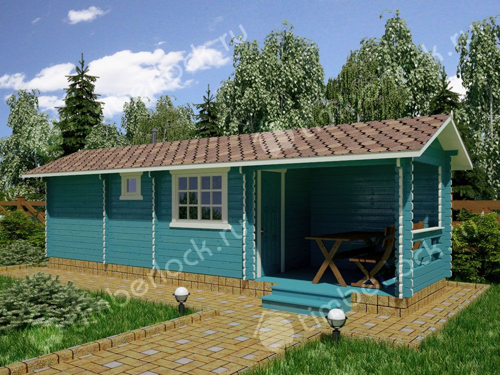 Вытянутая деревянная дачная баня из мини бруса с верандой под навесом и помывочной.
