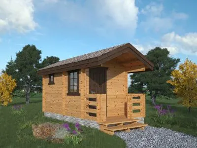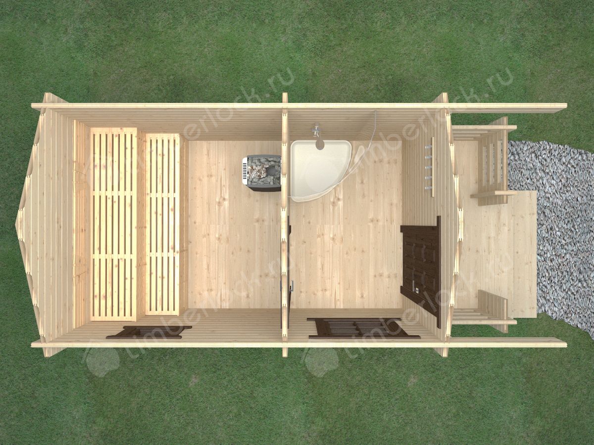 Эта компактная мини-банька подойдёт для небольшого садового участка. При небольших размерах в этой планировке есть полноценная парилка 2х2м и предбанник с местом для душевой кабины и небольшая веранда. Дровяная печь с панорамным стеклом придаст уют и комфорт вашему отдыху. Это отличный вариант бани для 2-4 человек.