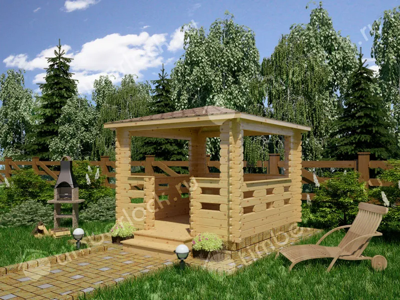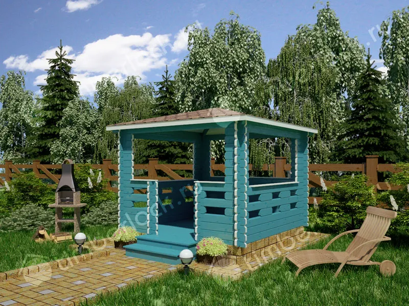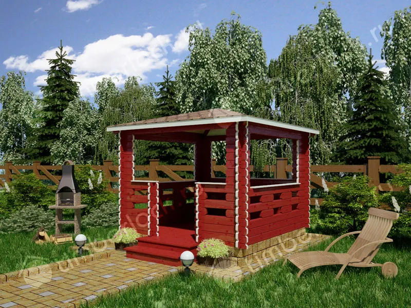 Универсальный вариант садовой беседки с крышей на четыре ската. Проектом предусмотрено помещение площадью 7.3м2 при общих размерах беседки 3х3м.