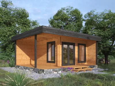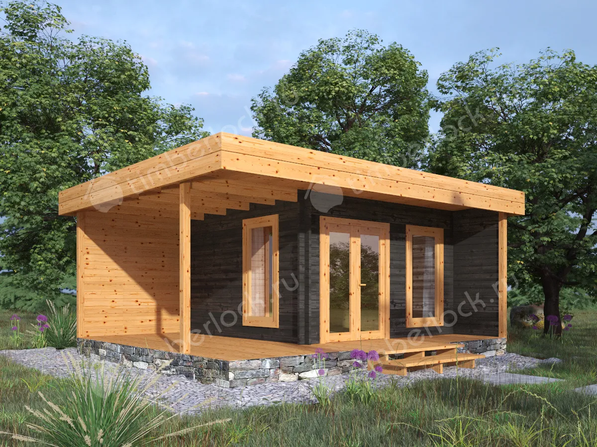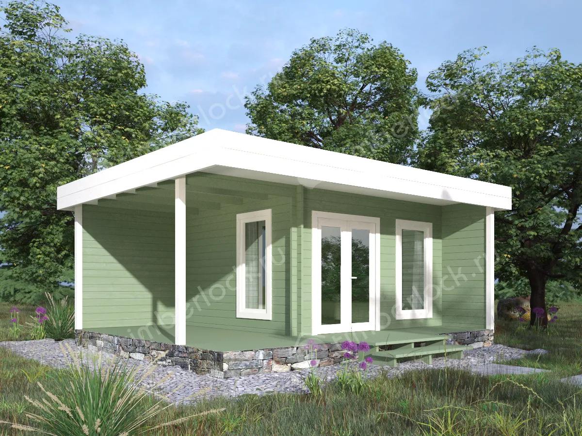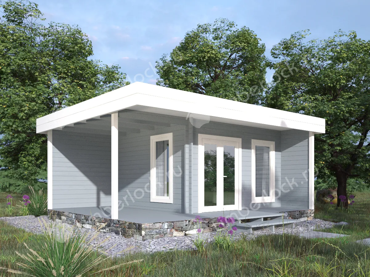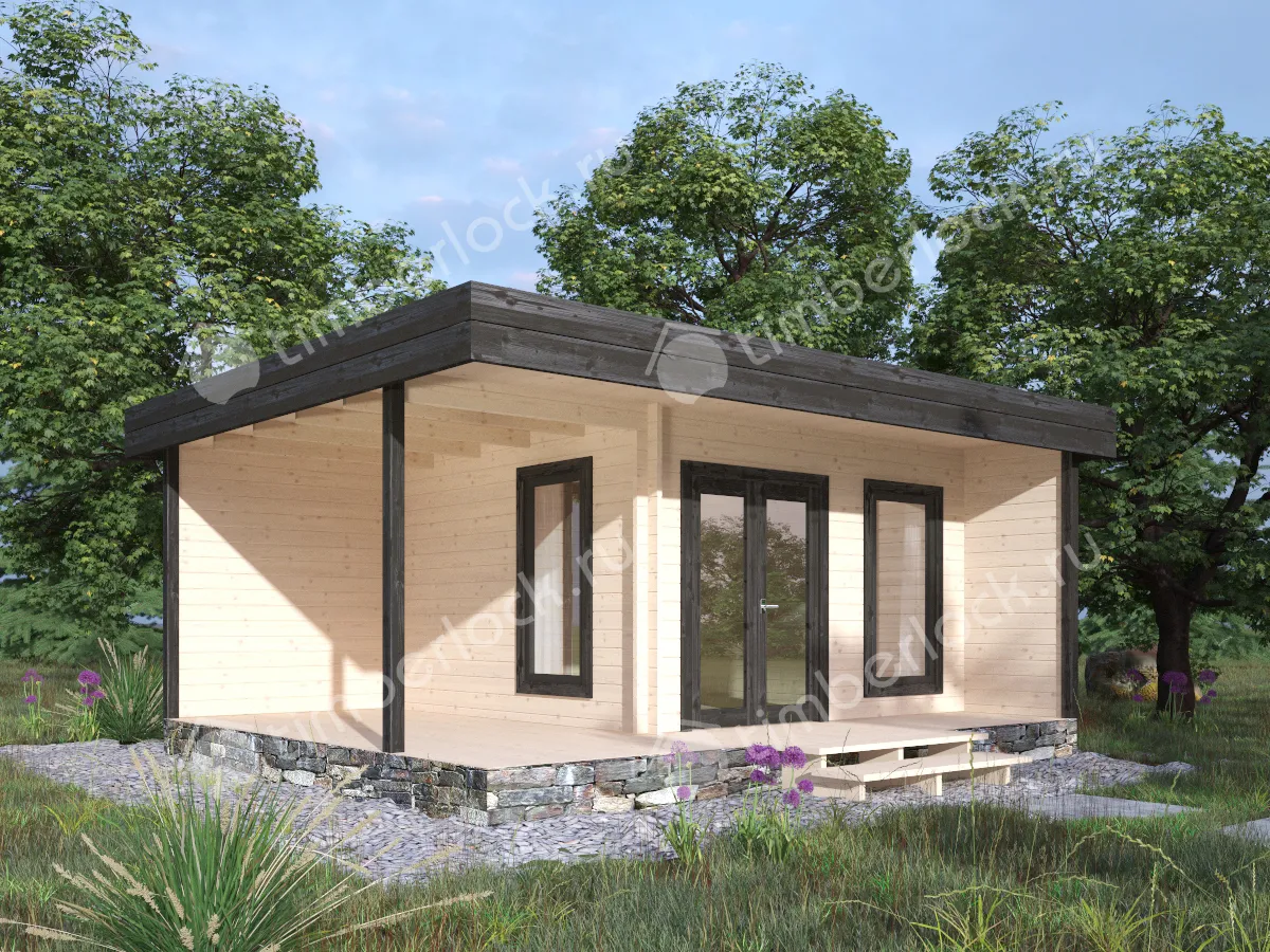 Уютная закрытая беседка для дачи с плоской крышей и большой открытой верандой.