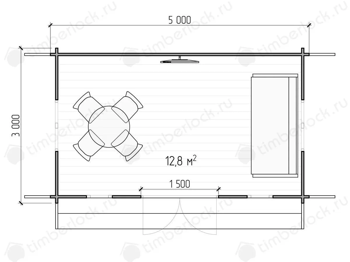 Универсальный проект загородной беседки для дачи с панорамным остеклением. Общая площадь беседки 12.8м2 при размерах 3х5м.