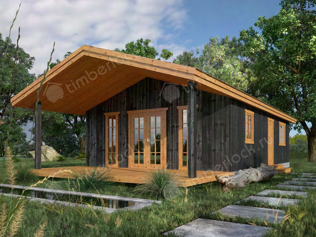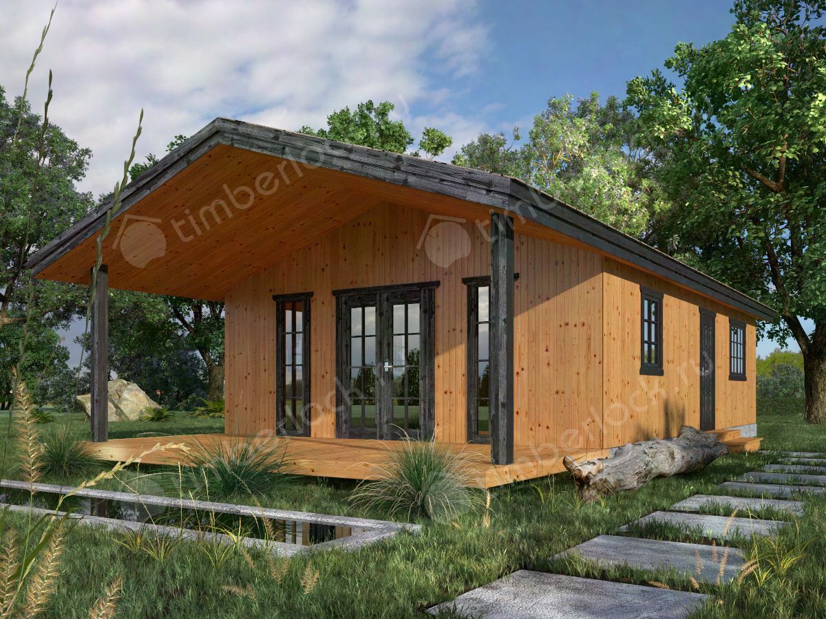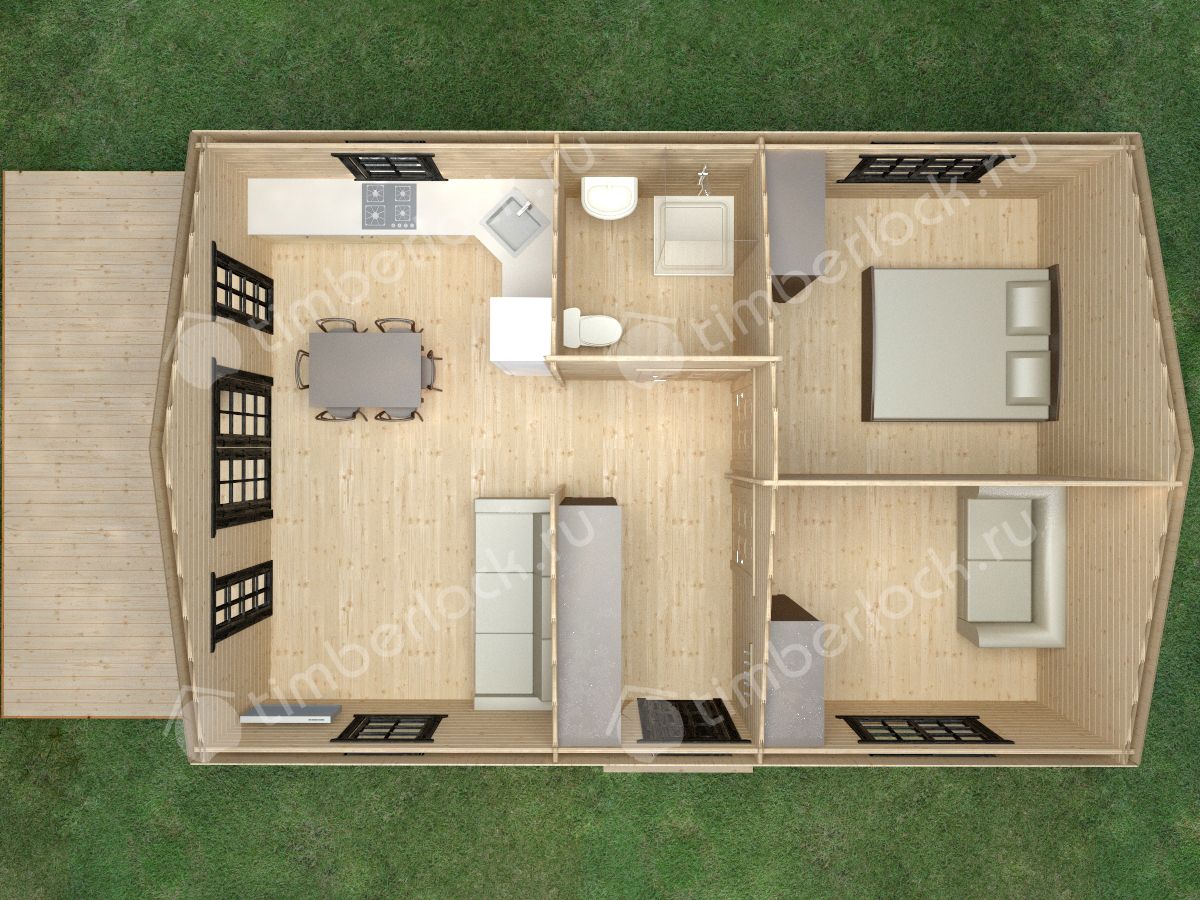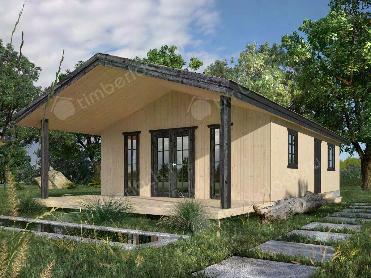 Уютный дачный коттедж в стиле шале с двумя спальнями, гостиной, кухней, санузлом и верандой.