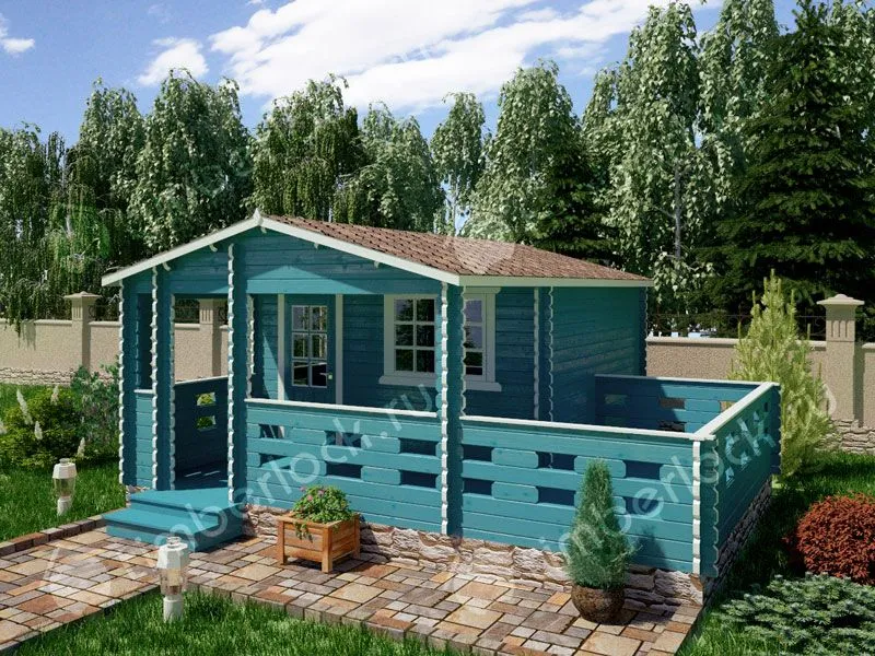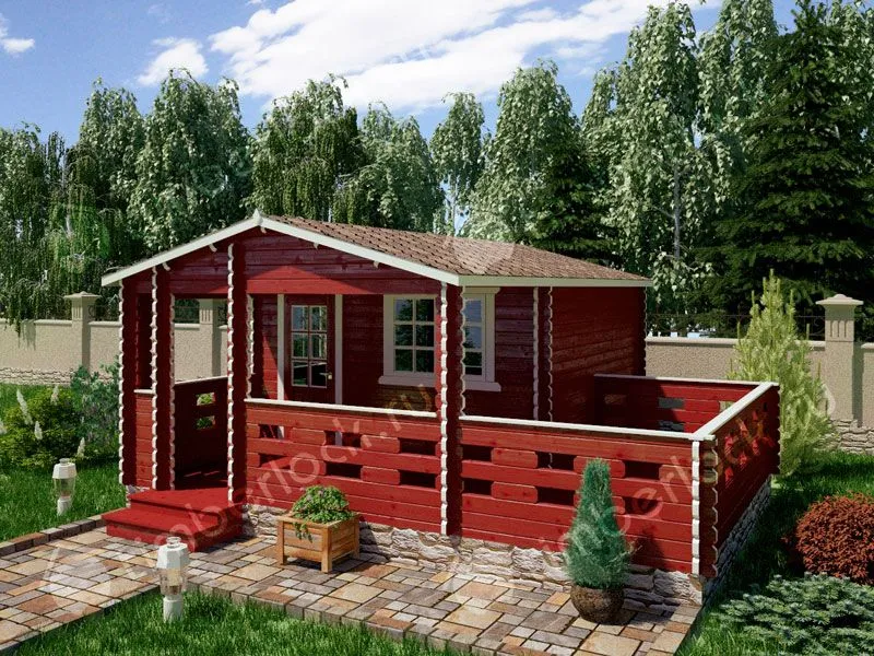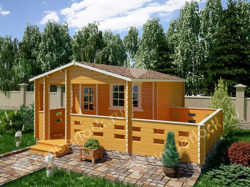 Интересный проект загородного дачного домика, в проекте которого предусмотрена одна большая комната и веранда, одна часть которой полностью открыта, а вторая находится под общей крышей.