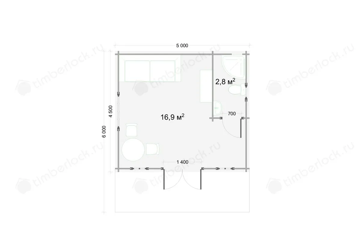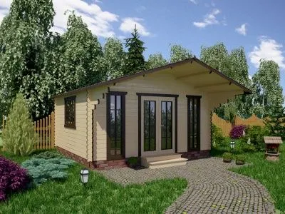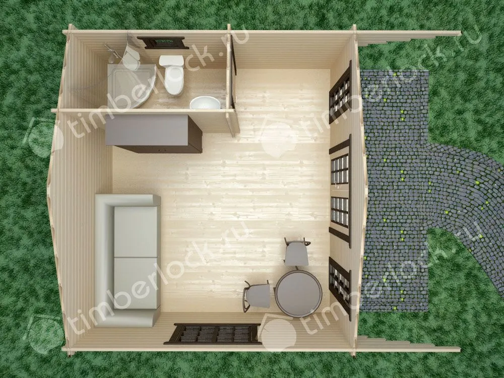 Красивый проект домика для строительства на пляжах и в общественных местах отдыха. В домике предусмотрена одна просторная комната и санузел. А также большой навес, под которым можно спрятаться от солнца или дождя.