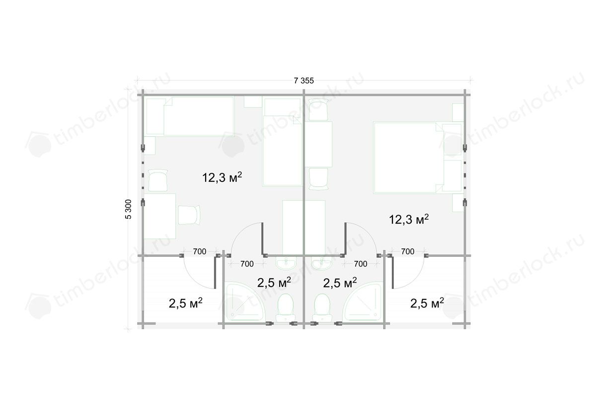 Функциональный пляжный домик общей площадью 34.6 м2. Домик разделен на две симметричные части с отдельным входом и рассчитан на проживание двух клиентов.