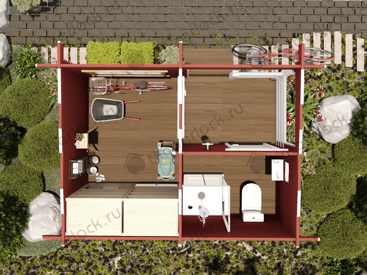 Хозблок для дачного участка: комната отдыха, туалет и душ.