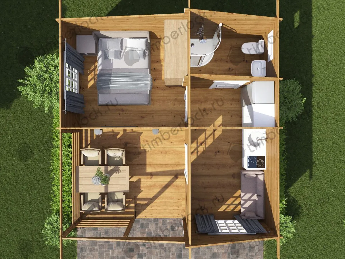 Отличный кемпинговый дом с верандой, одной спальней, кухней и санузлом. Просторная веранда и большое окно позволяют наслаждаться каждой минутой, проведённой на природе.