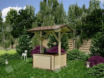 Типовой проект колодца собирается из профилированной доски. Размер - 1.6м х 1.6м. Над основанием располагается навес. Деревянная конструкция устанавливается на бетонное колодезное кольцо. Наш колодец не только помогает набирать воду, но также служит отличным украшением участка.