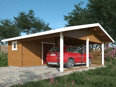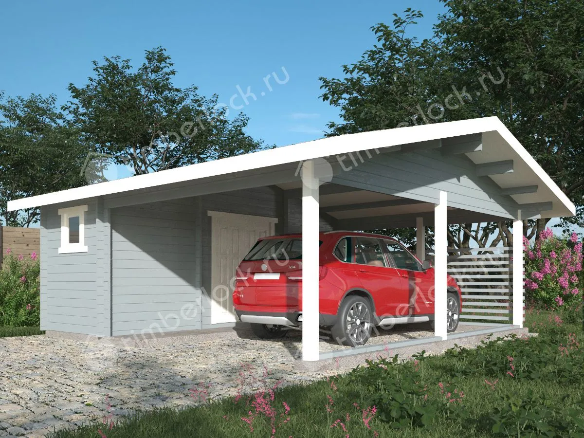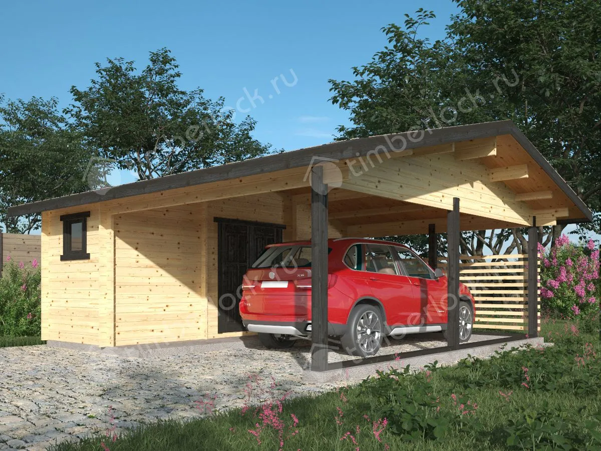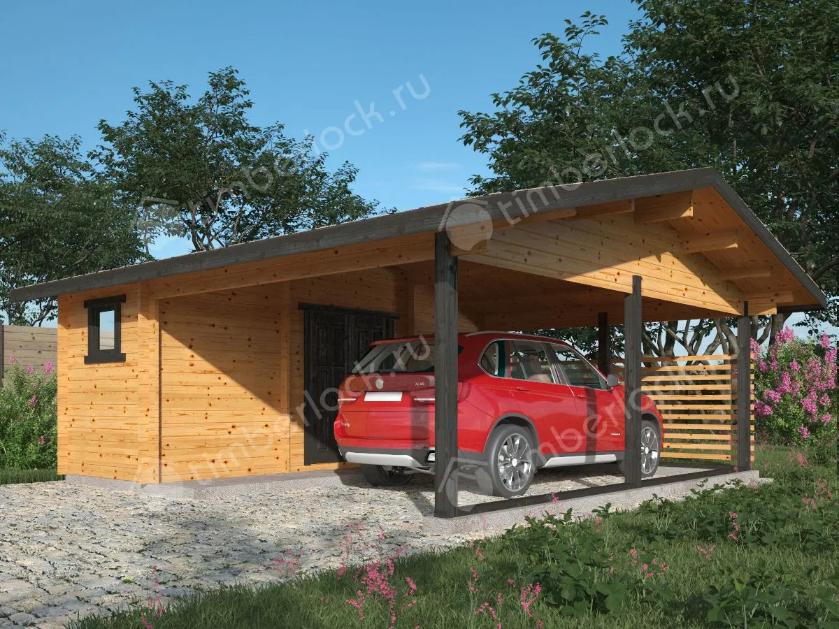 Навес деревянный для автомобиля с хозблоком для хранения шин и садового инвентаря. Практичное решение для вашего дачного участка.