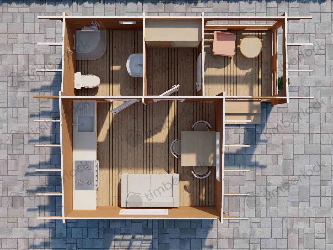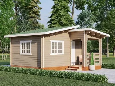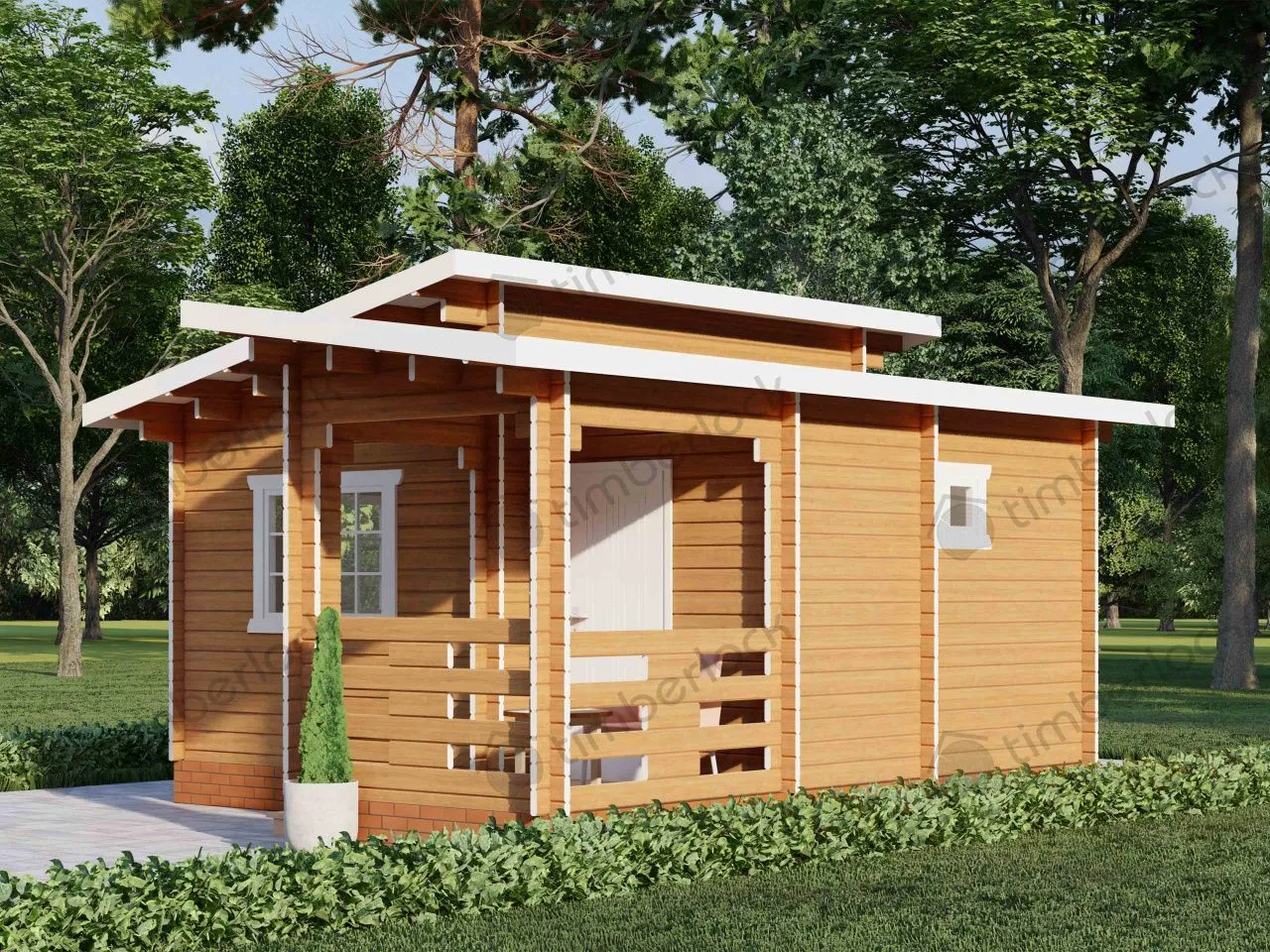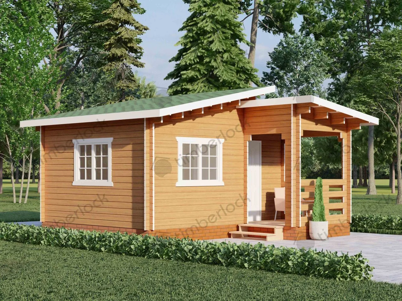 Садовый домик средних размеров с небольшим крыльцом - отличное решение для небольшого дачного участка. Можно использовать для временного проживания в дачный сезон с весны до осени.