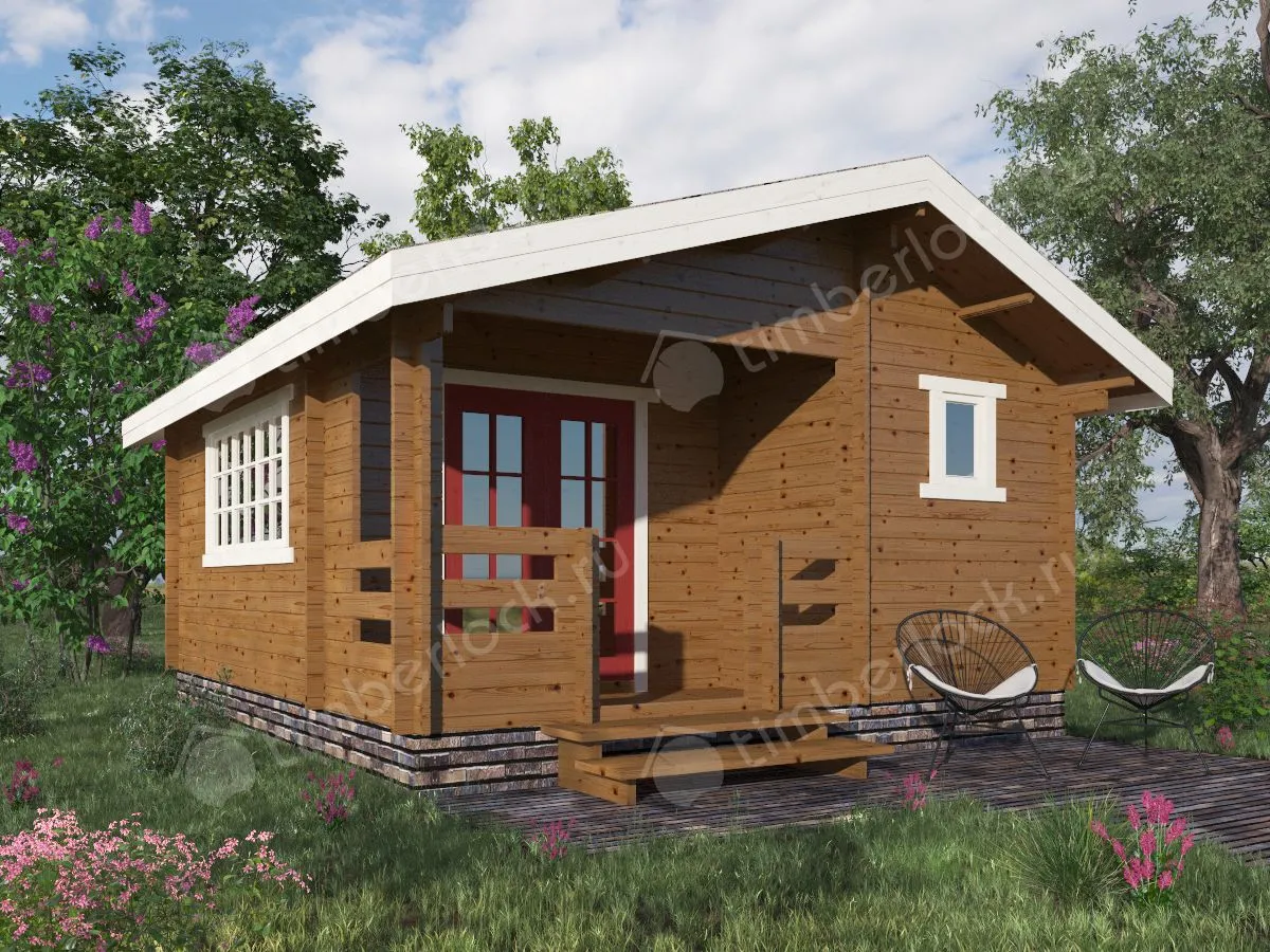 Садовый домик средних размеров с небольшой верандой.