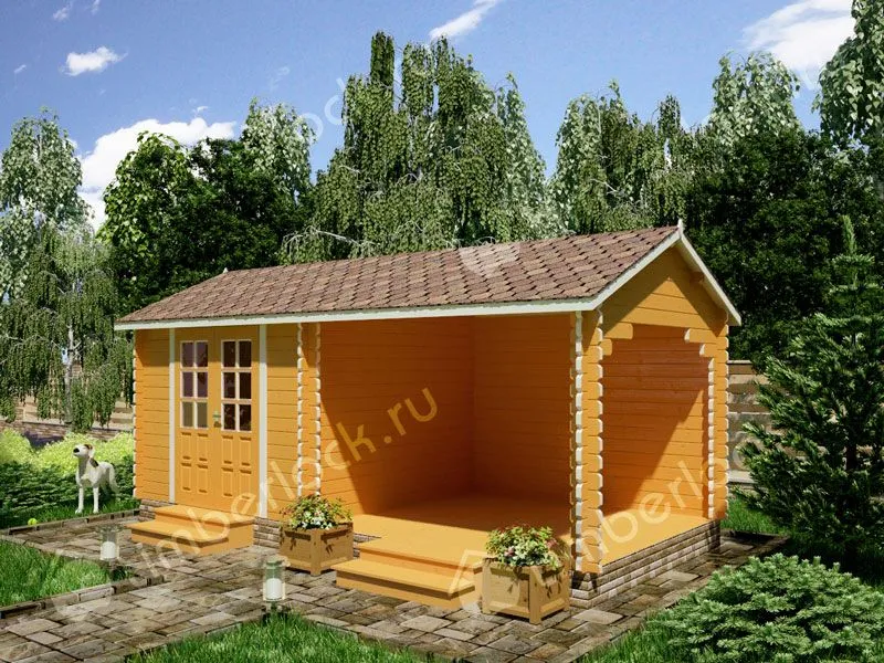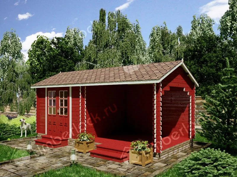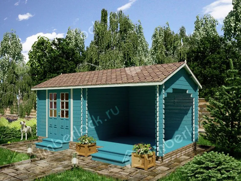 Двухсекционный садовый домик с открытой и закрытой зоной. Закрытое помещение можно использовать как комнату отдыха или летнюю кухню, открытую зону - как место для хранения инвентаря или веранда.