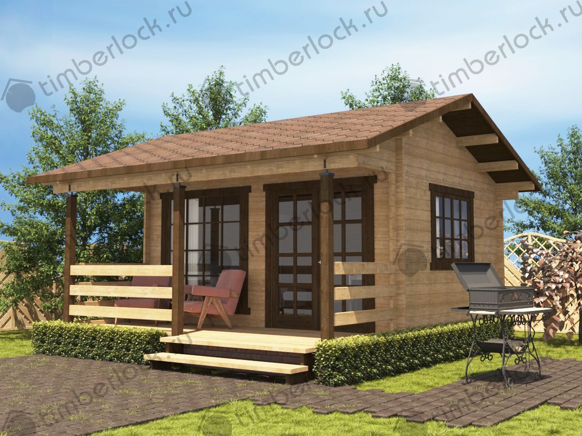 Минималистичный садовый домик небольших размеров с верандой подойдёт для небольшого участка. Может использоваться в качестве летней кухни.