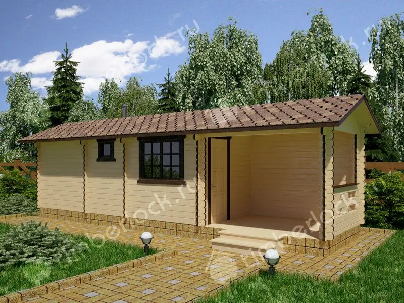 Вытянутая деревянная дачная баня из мини бруса с верандой под навесом и помывочной.