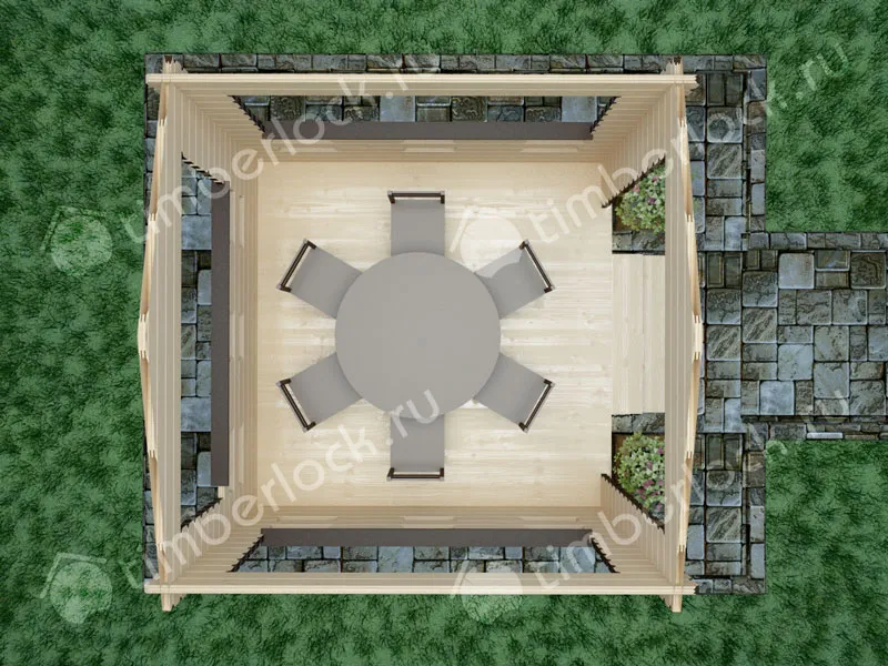 В беседке можно разместиться компанией до 6-ти человек. При желании можно поставить в проёмы шпалеры для того, чтобы можно было вокруг посадить плетистые растения. Также можно заказать прозрачные мягкие окна, чтобы защититься от ветра и дождя.