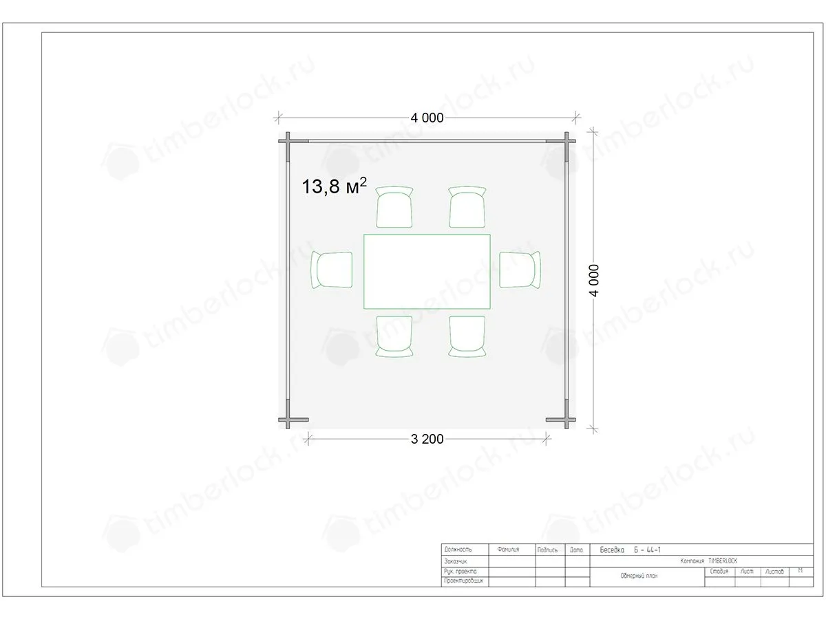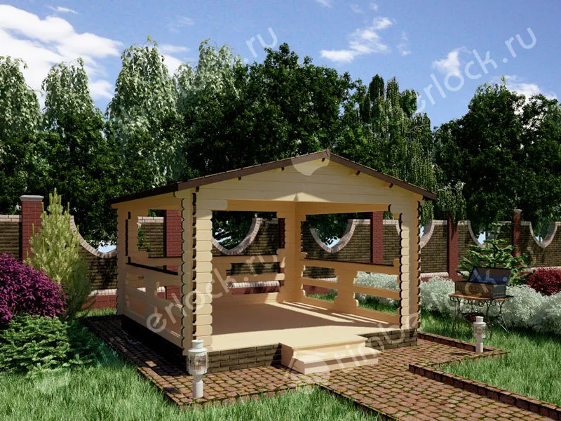 Отличный проект беседки для загородного участка. Беседка не застекленная и без сквозного прохода. Размеры 4х4м и площадь 13.8м2 позволяют разместиться достаточно большой компании.