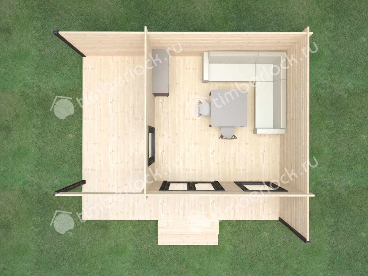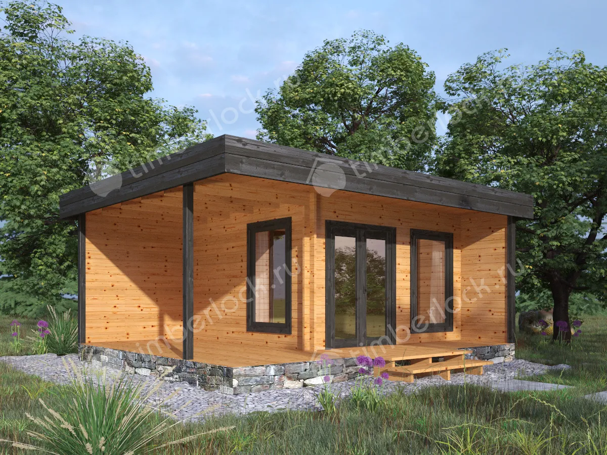 Уютная закрытая беседка для дачи с плоской крышей и большой открытой верандой.