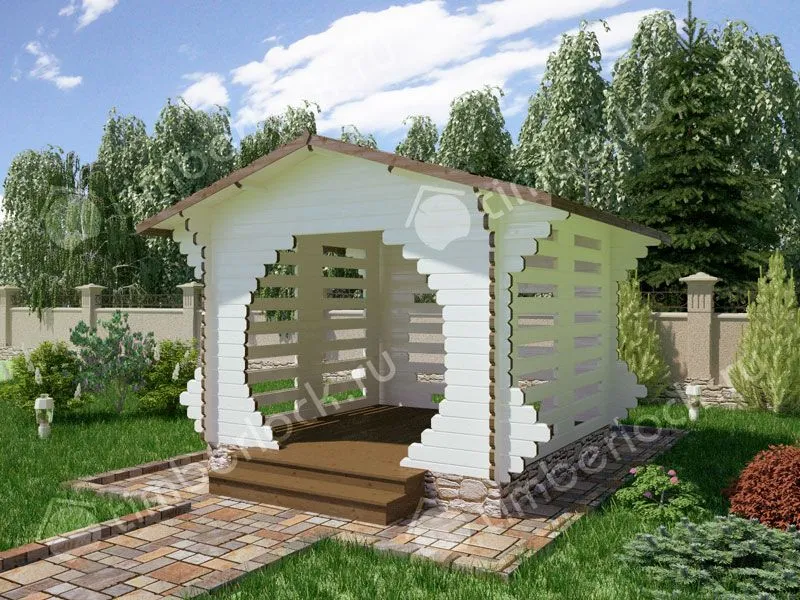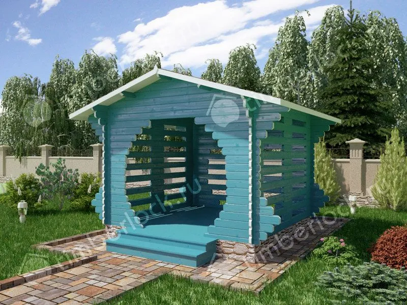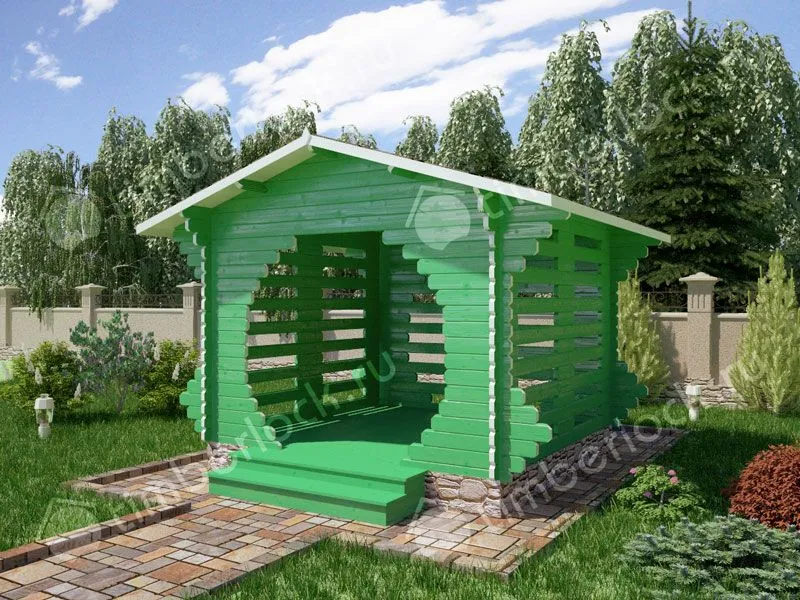 Интересный вариант нестандартной беседки для загородного дома или детского сада. Полезная площадь составляет 10.3м2 при размерах 4.5х4м.