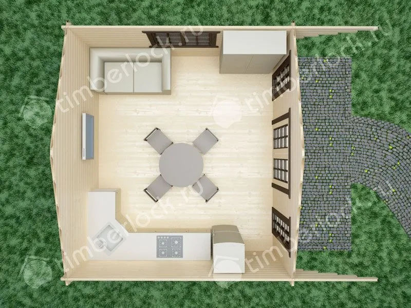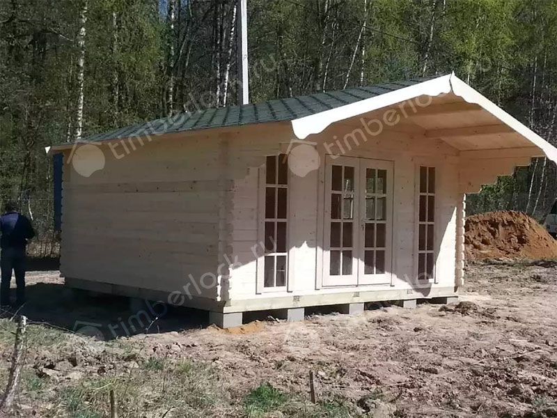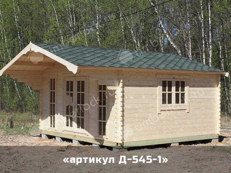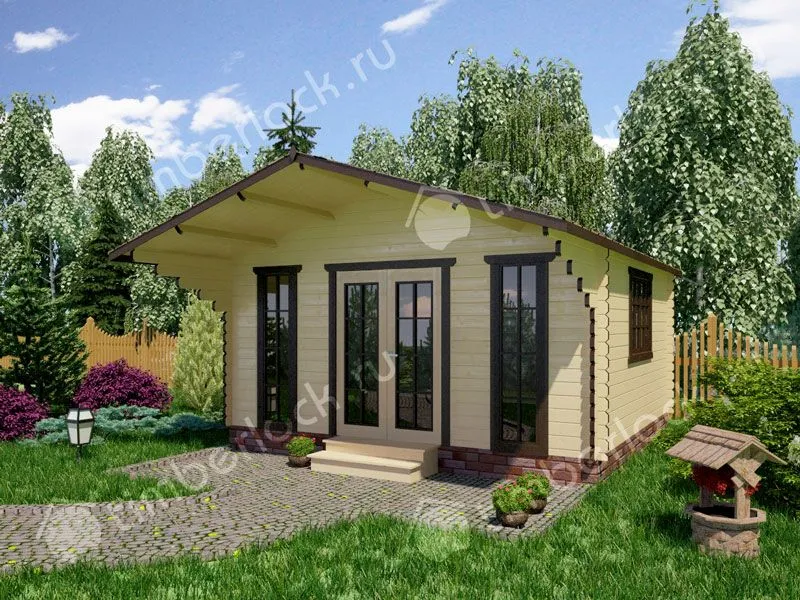Универсальный дачный домик с одной большой комнатой, одним окном на боковом фасаде и двойными распашными дверьми.
