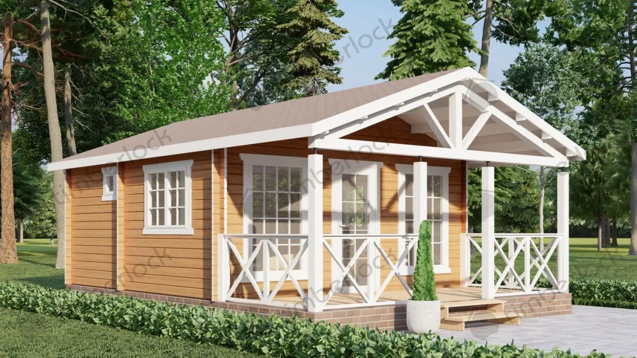 Проект дачного домика с одной спальней, зоной кухни и санузлом. Такая планировка позволяет использовать дом как гостевой и для небольшой семье до 3-х человек.