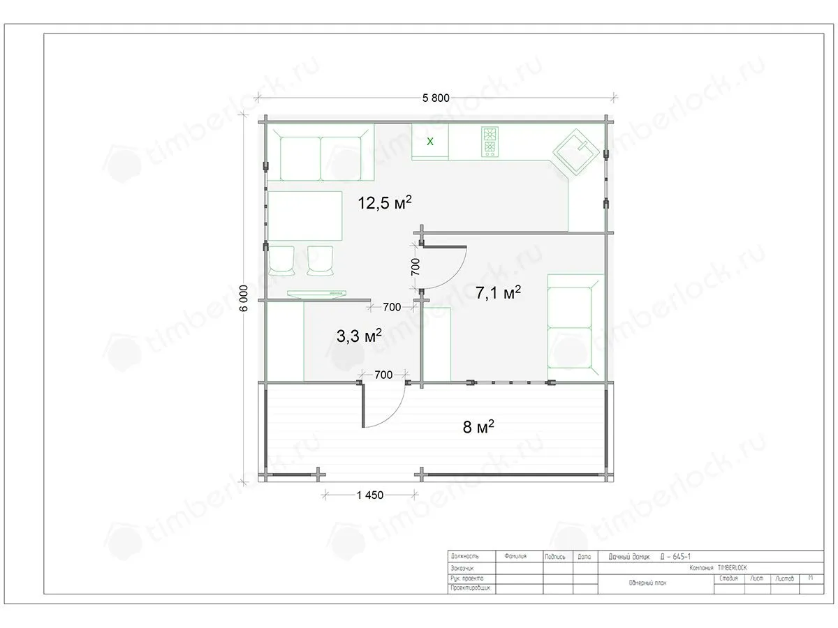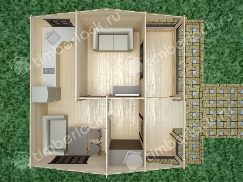 Дачный домик с террасой, тамбуром, гостиной и спальней.