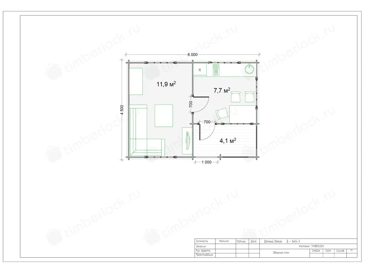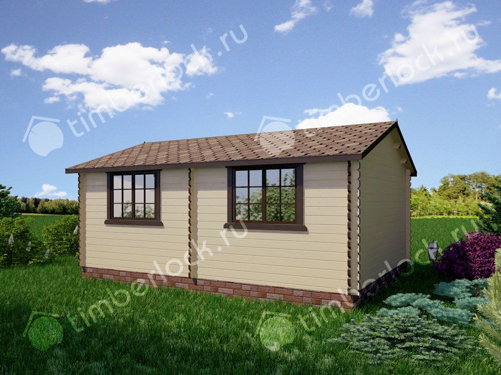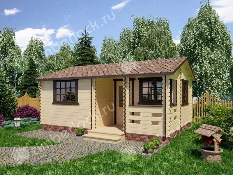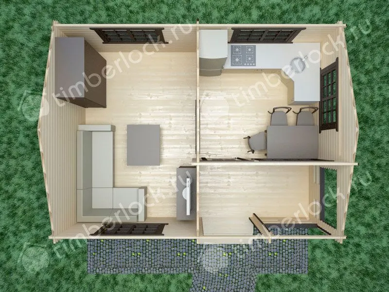 Универсальный проект дачного домика с двумя раздельными комнатами, одна из которых - кухня, вторая - спальня-гостиная.
