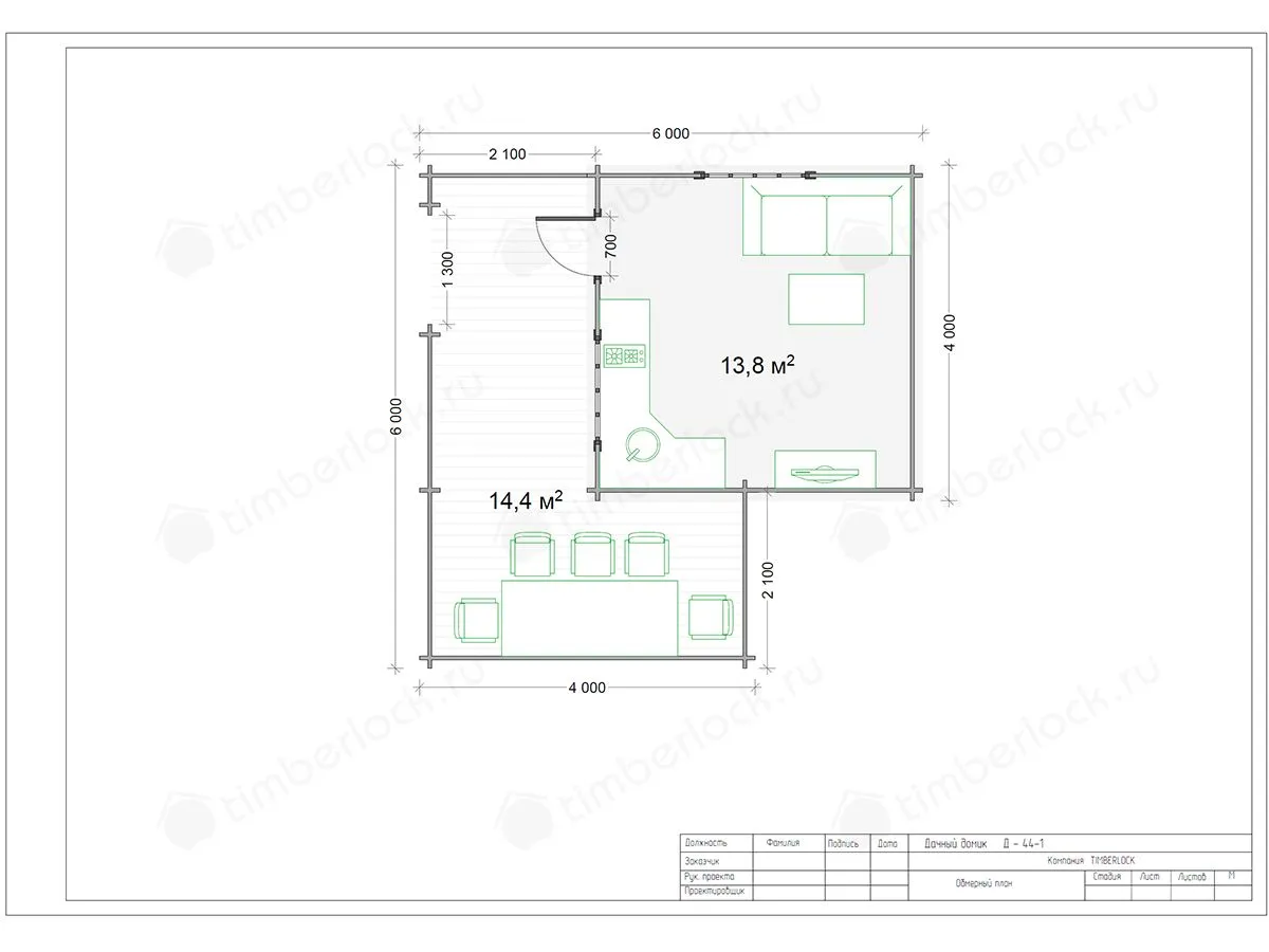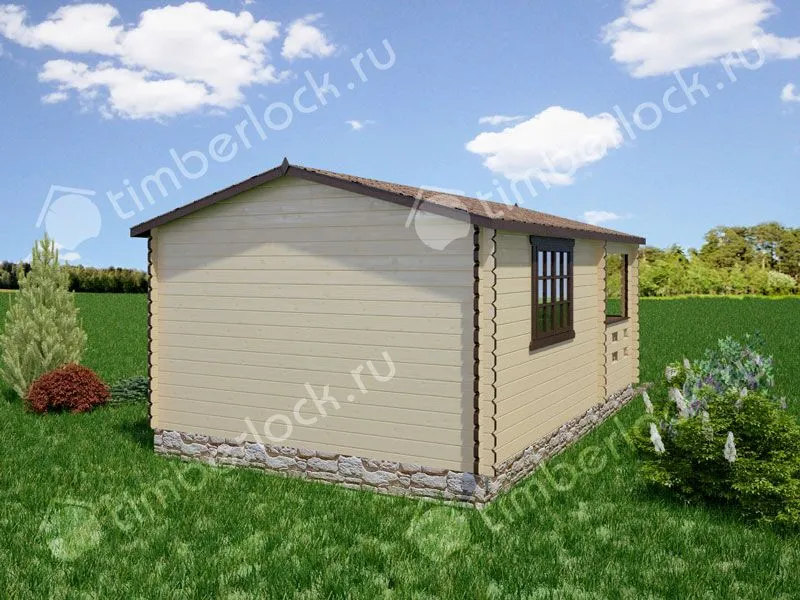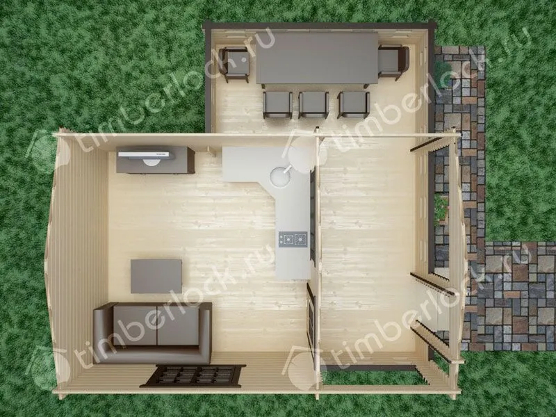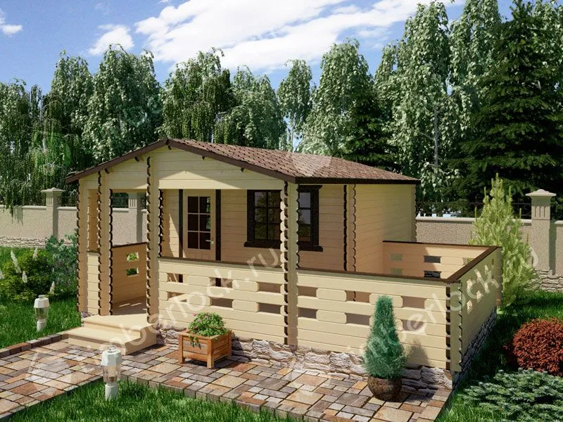 Интересный проект загородного дачного домика, в проекте которого предусмотрена одна большая комната и веранда, одна часть которой полностью открыта, а вторая находится под общей крышей.