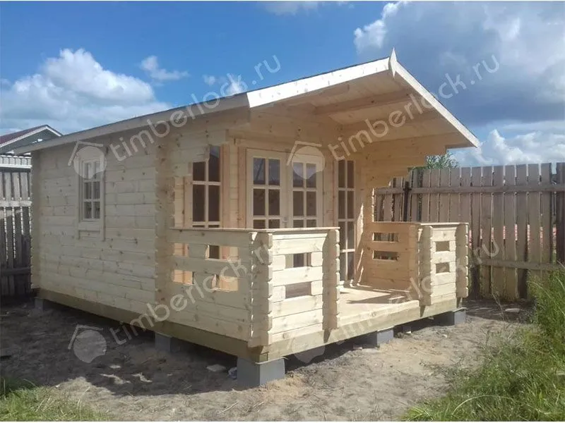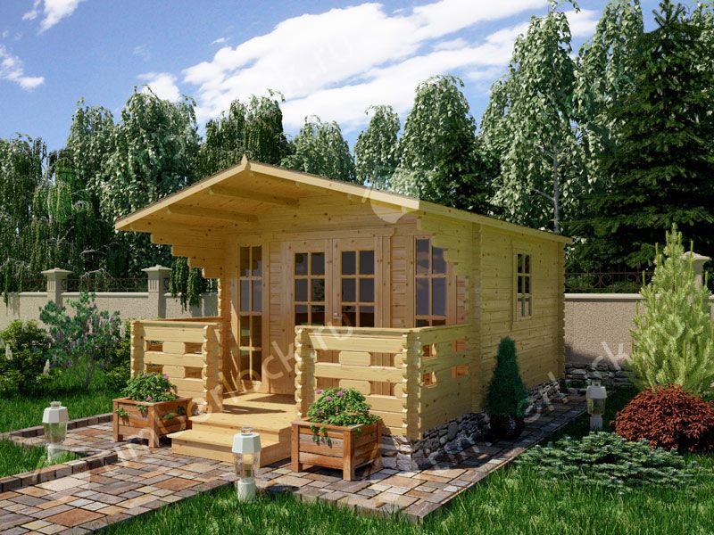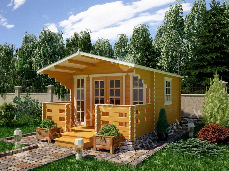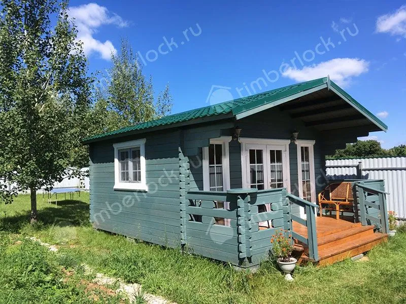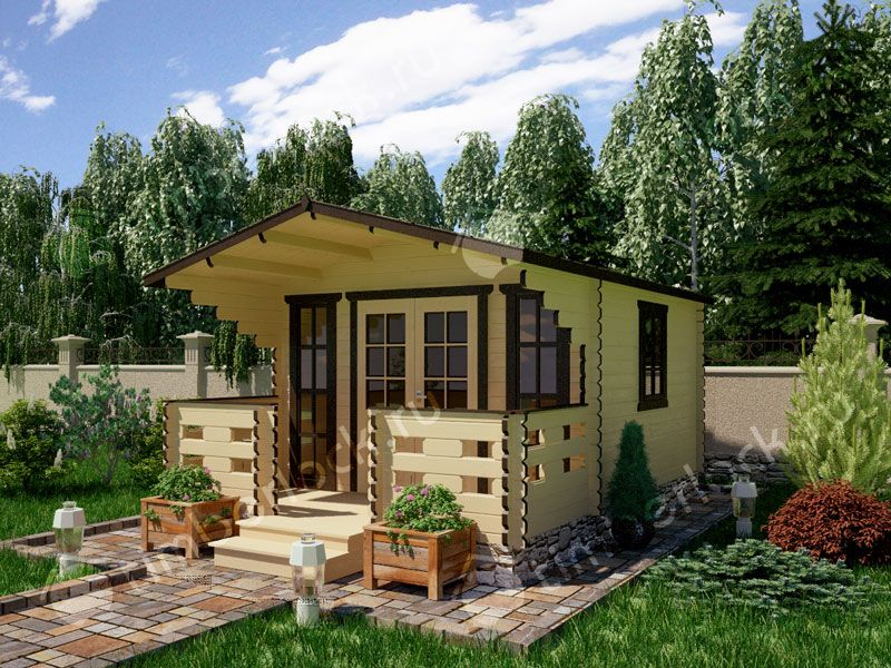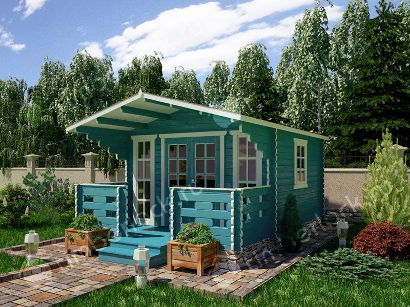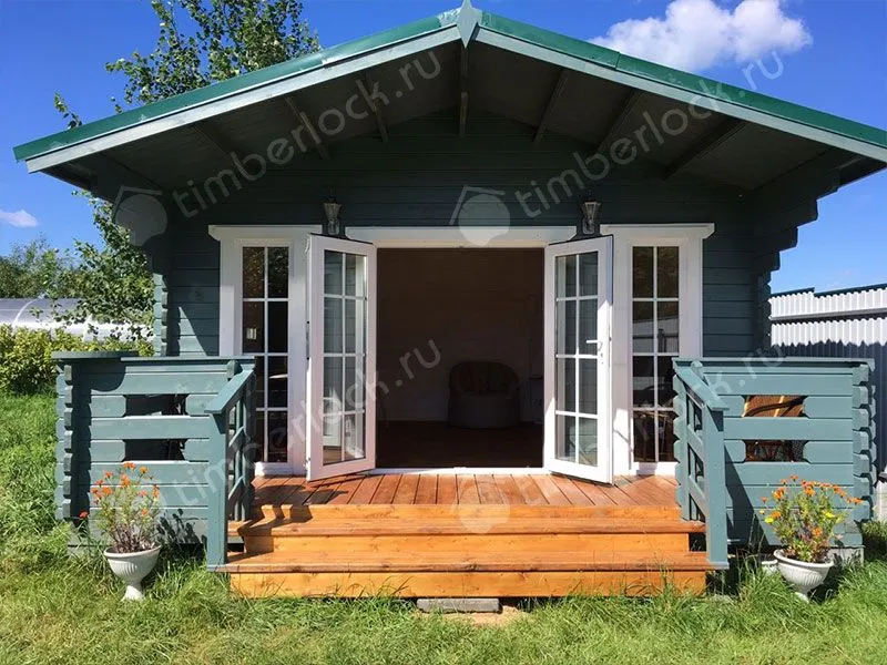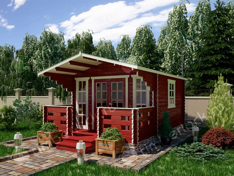 Садовый домик средних размеров с верандой.