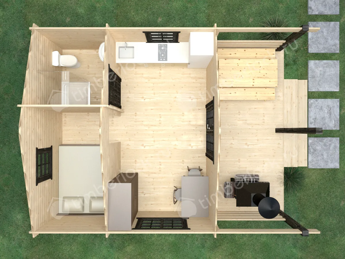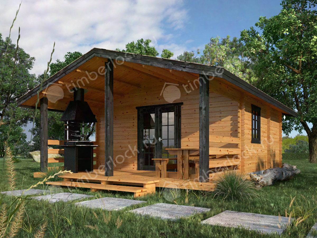 Одна из интересных новинок среди наших проектов. Благодаря продуманной планировке и наличию веранды этот проект популярен среди проектов кемпинговых домиков.