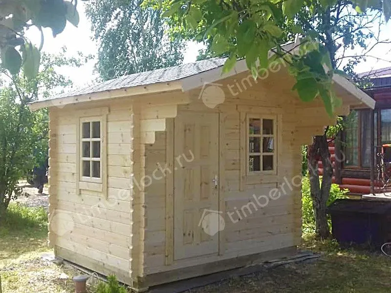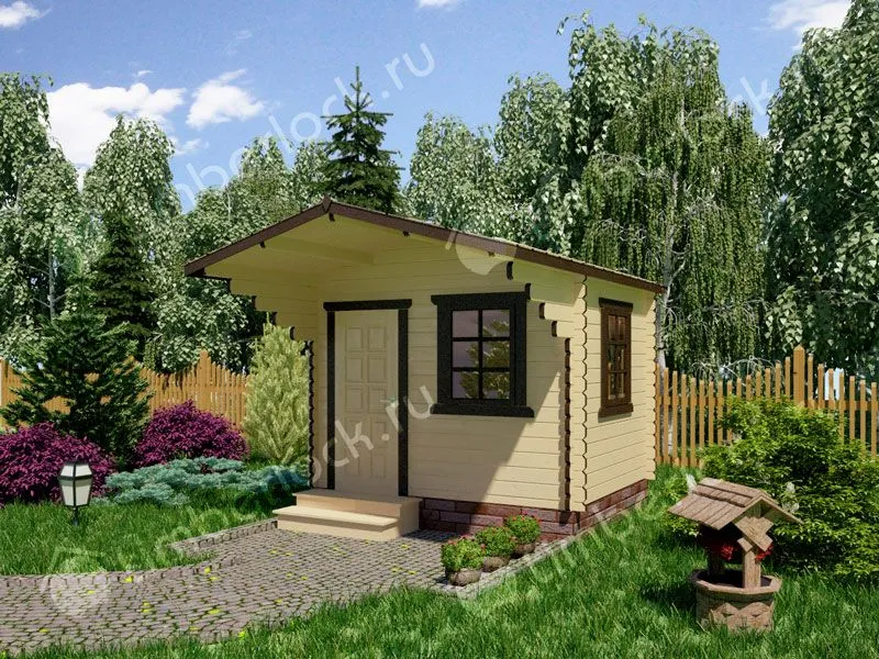 Компактный садовый домик с небольшим навесом для организации летнего отдыха на садовом участке.