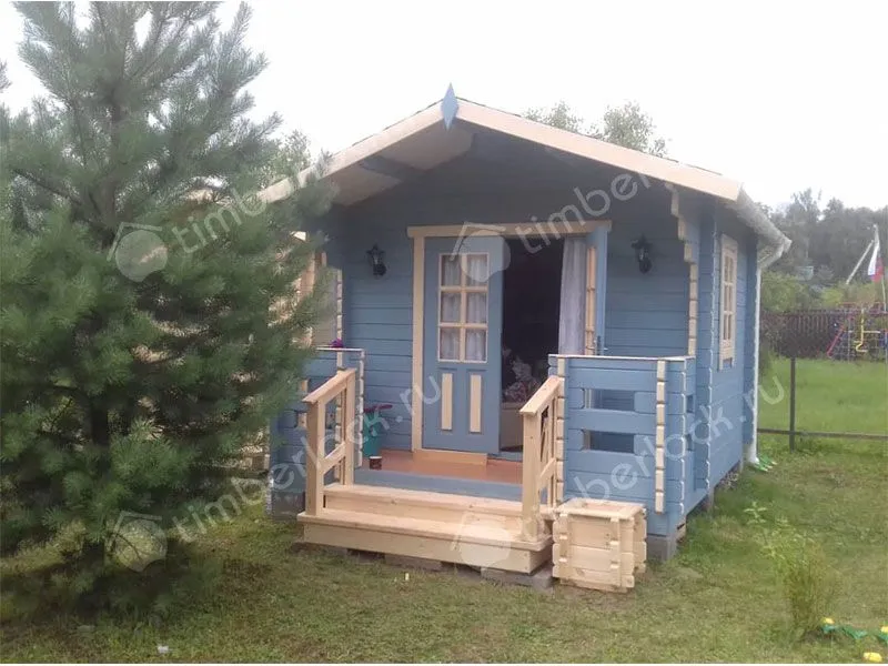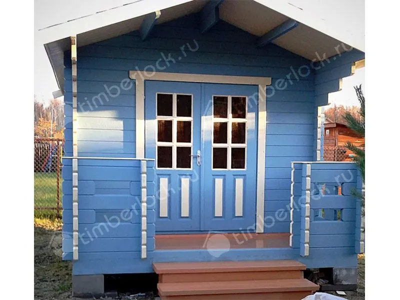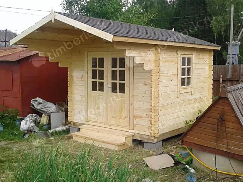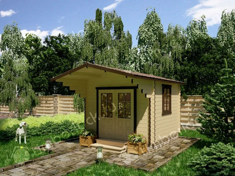 Компактный садовый домик с навесной крышей.