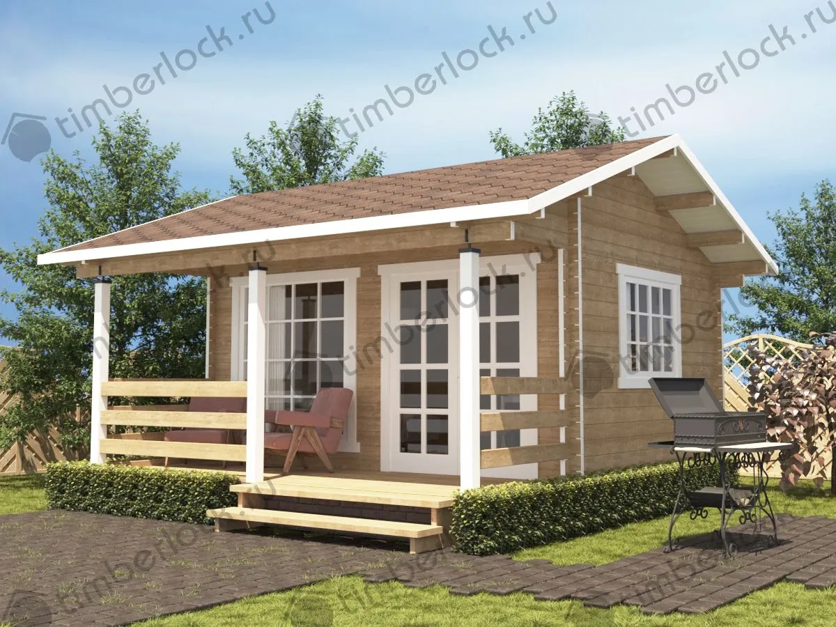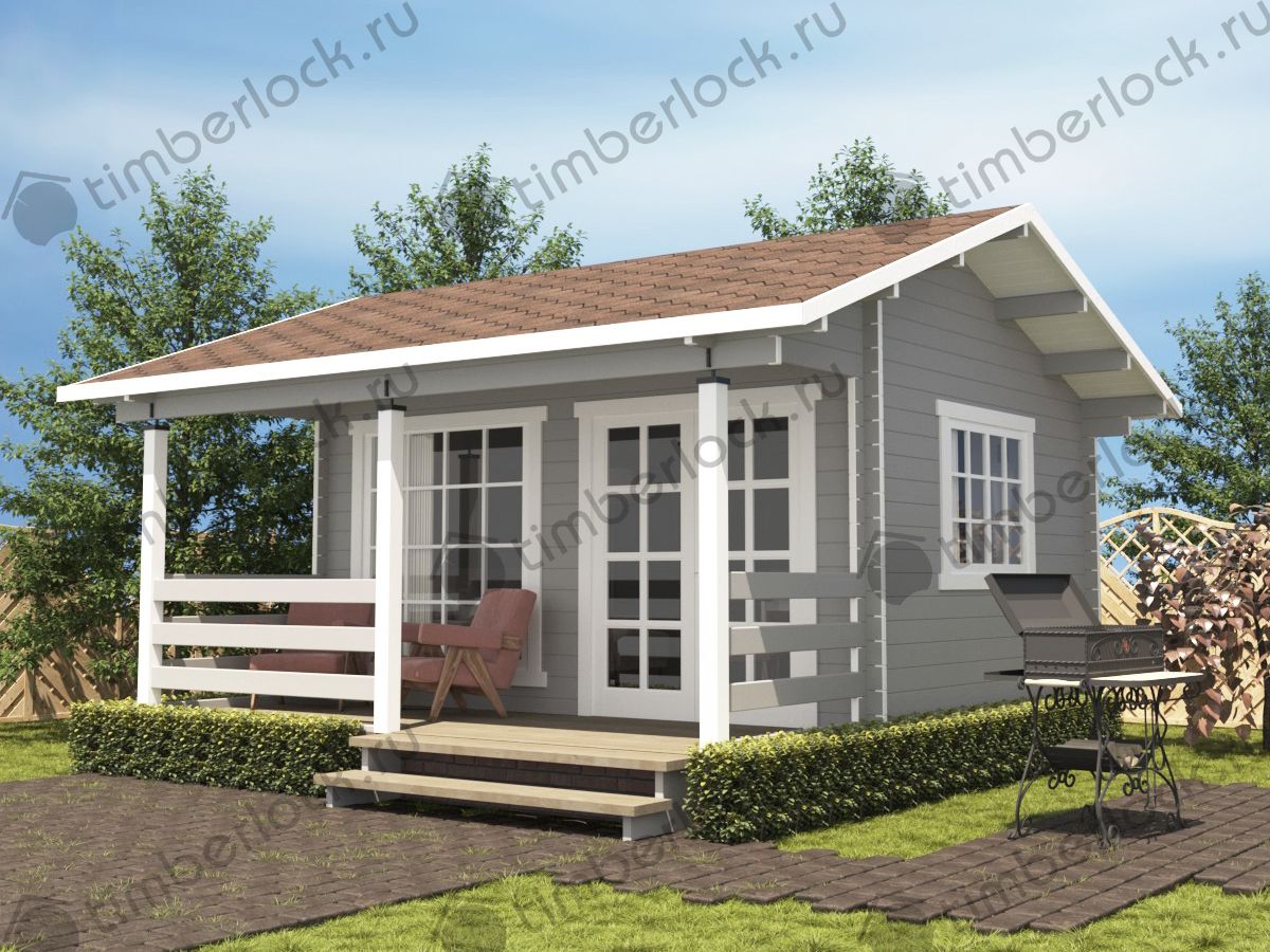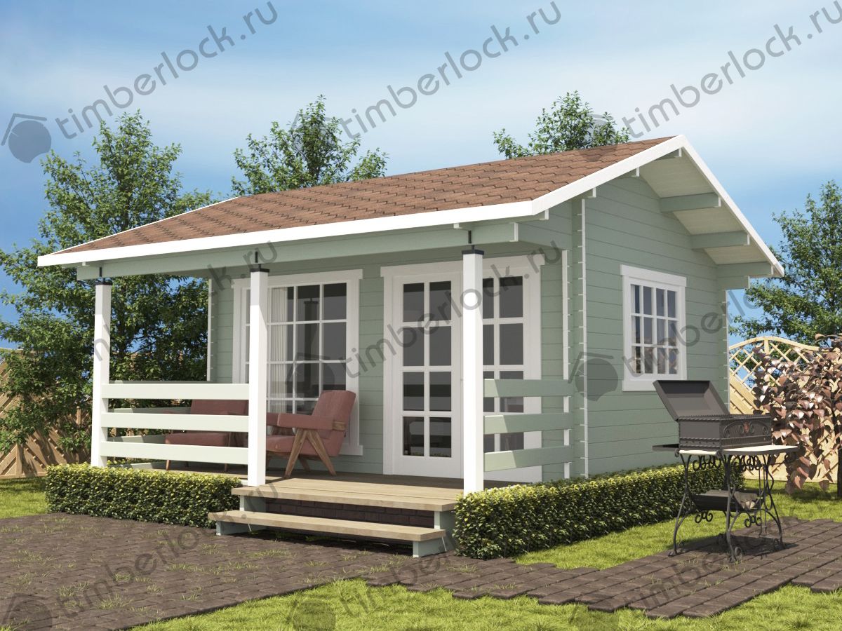 Минималистичный садовый домик небольших размеров с верандой подойдёт для небольшого участка. Может использоваться в качестве летней кухни.