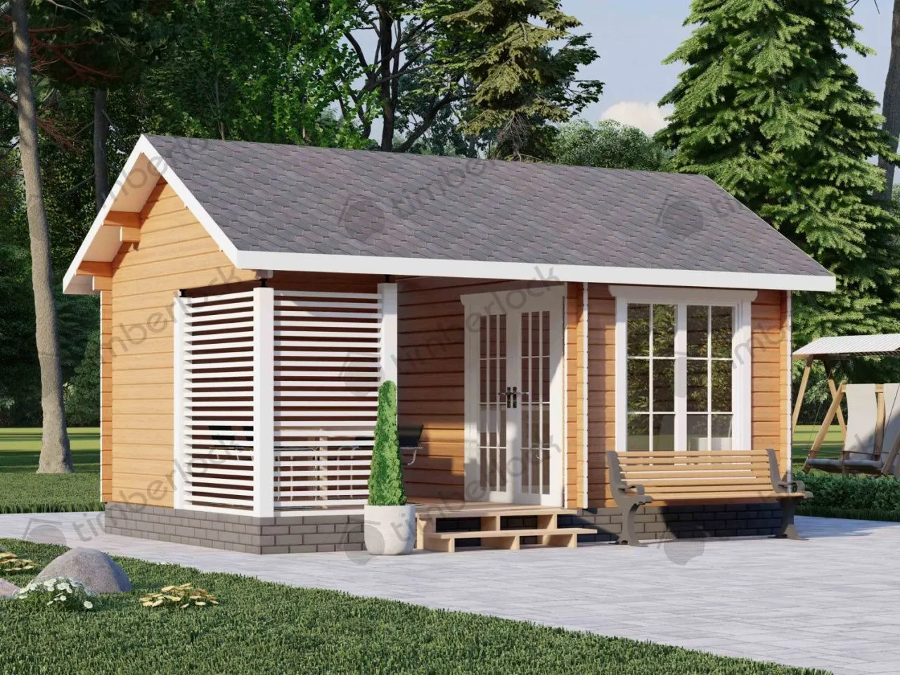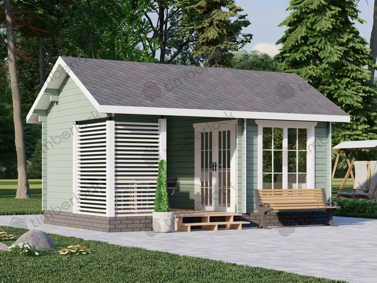 Садовый домик средних размеров с верандой - прекрасное решение для небольшого дачного участка. Можно использовать для временного проживания в тёплое время года, как летнюю кухню или как гостевой домик.