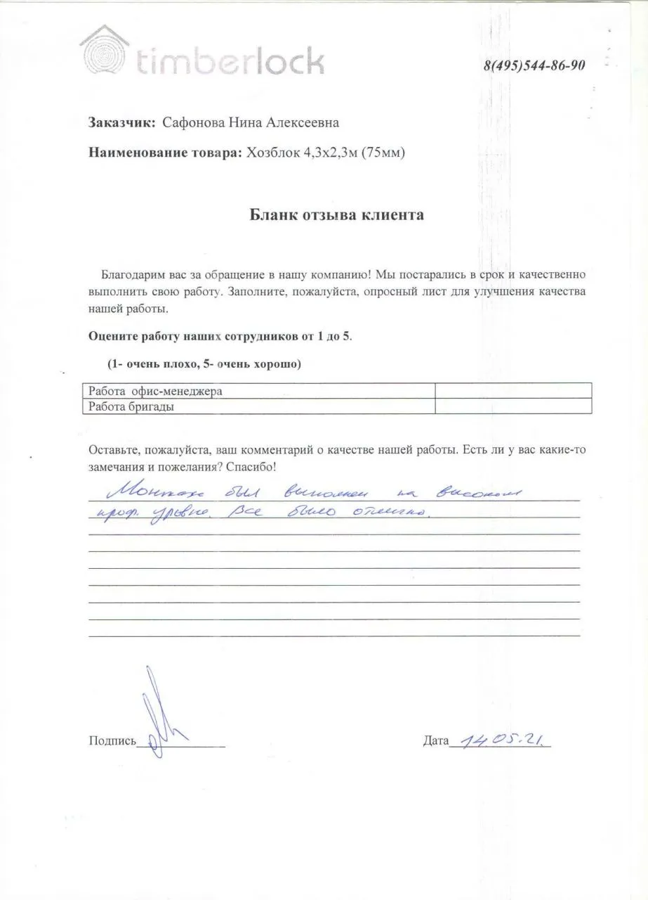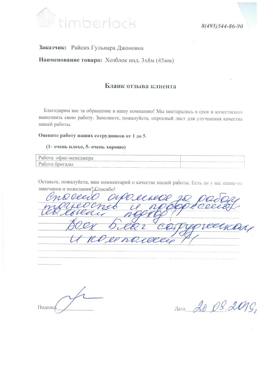 Хочу выразить огромную благодарность компании "Тимберлок", за быстрое, качественное, профессиональное строительство моего красивого хозблока (под ключ). Рабочая команда слажена, замечательные ребята, знающие свое дело. Выполнили за 1 день, точно в срок! А также благодарность их руководству. Мне очень все понравилось. Рекомендую!!!